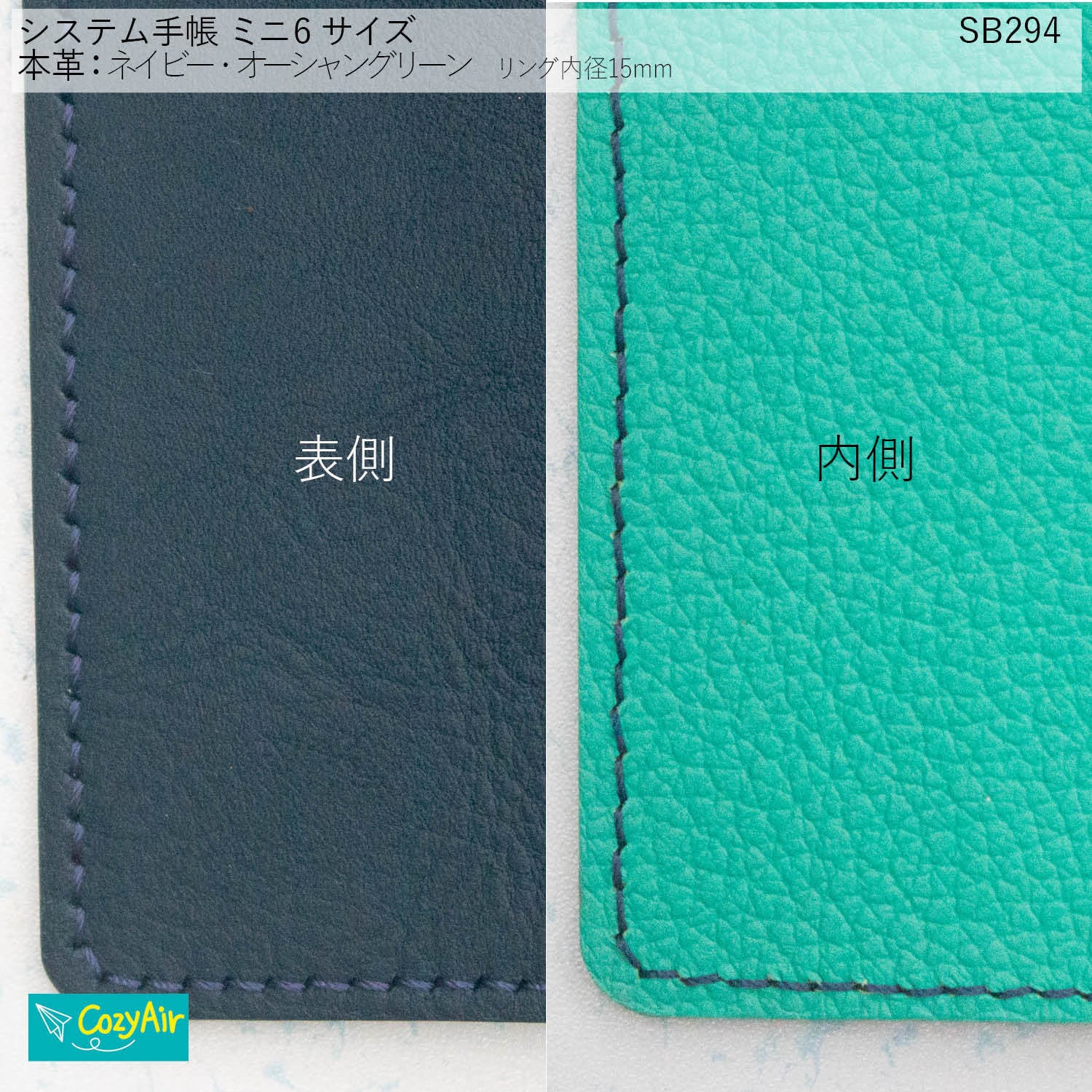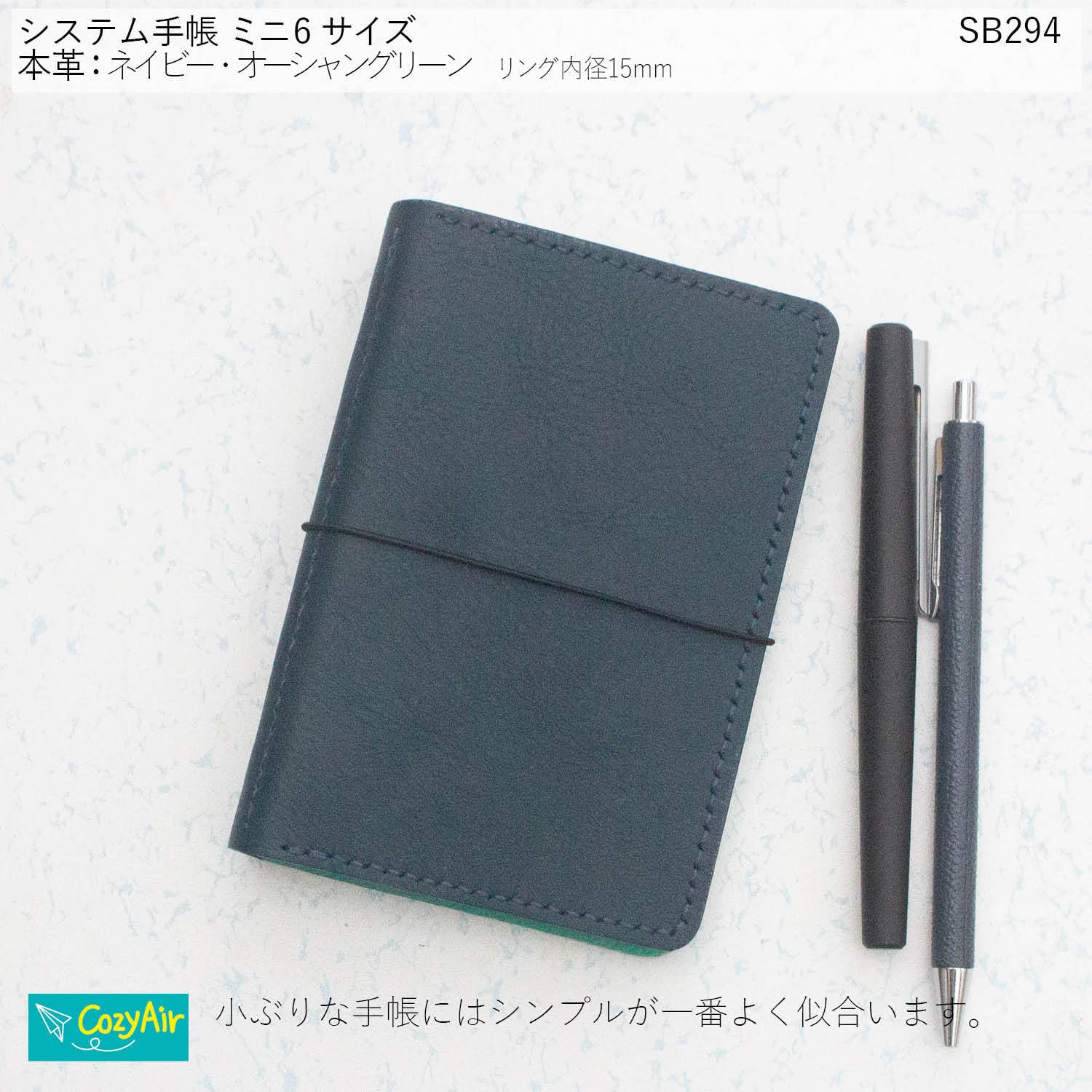 SB294 ミニ6サイズ M6 システム手帳 リング径15mm 本革・ネイビー・オーシャングリーン