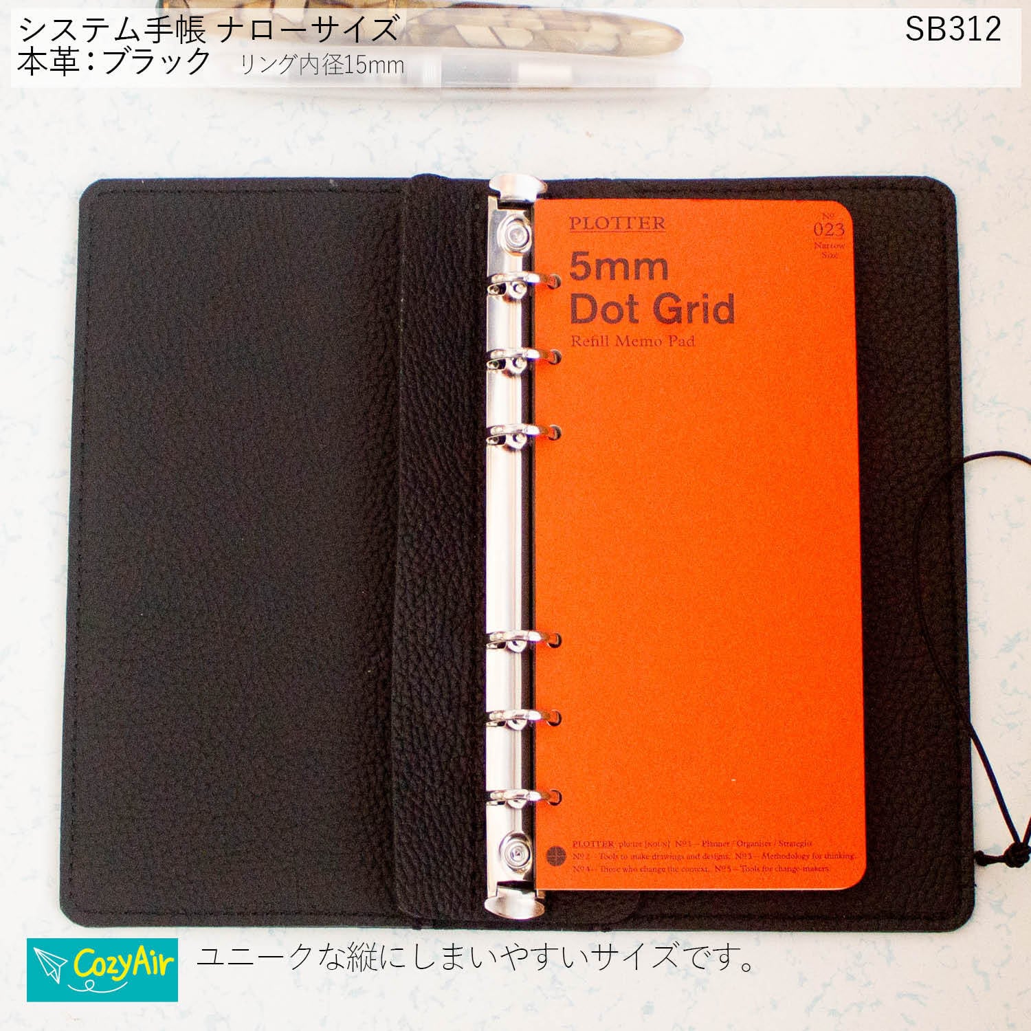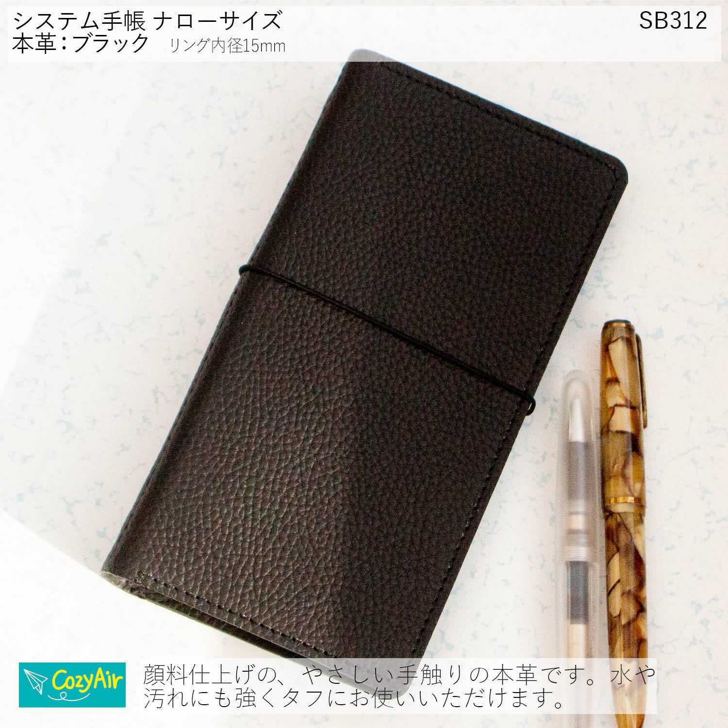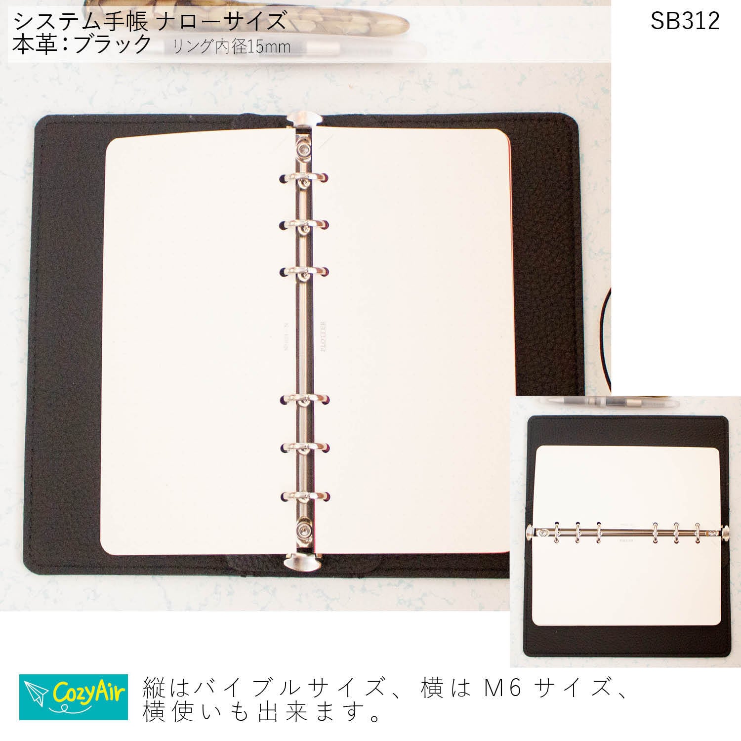 SB312 胸ポケットに収まるシステム手帳 ナローサイズ シンプルデザイン リング径15mm 本革ブラック