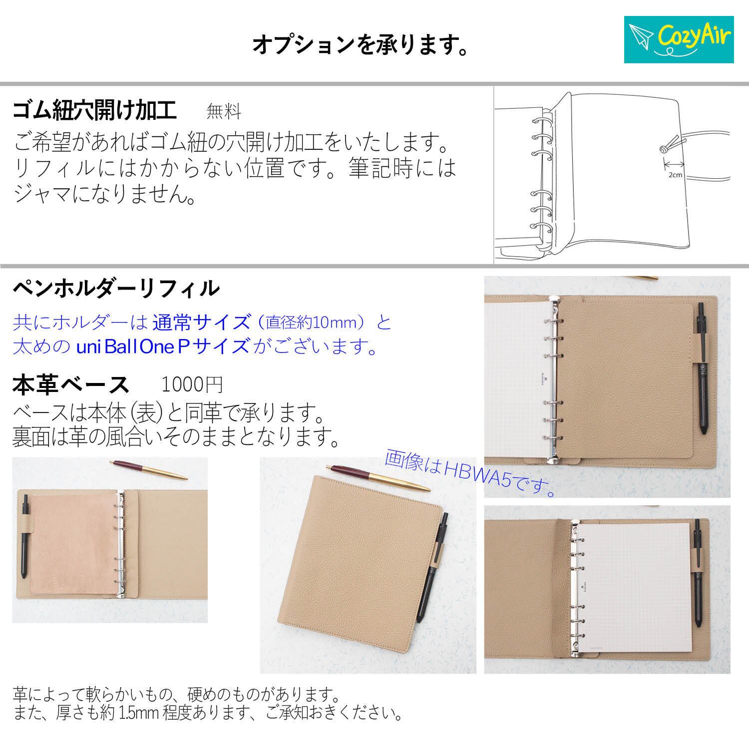 オプションでゴム紐穴加工やペンホルダーリフィルも承ります。ペンホルダーの内径は2種類ご指定いただけます、通常用(内径約10mm)と小さめの手帳にぴったりで少し太めのuni Ball One Pタイプです。
