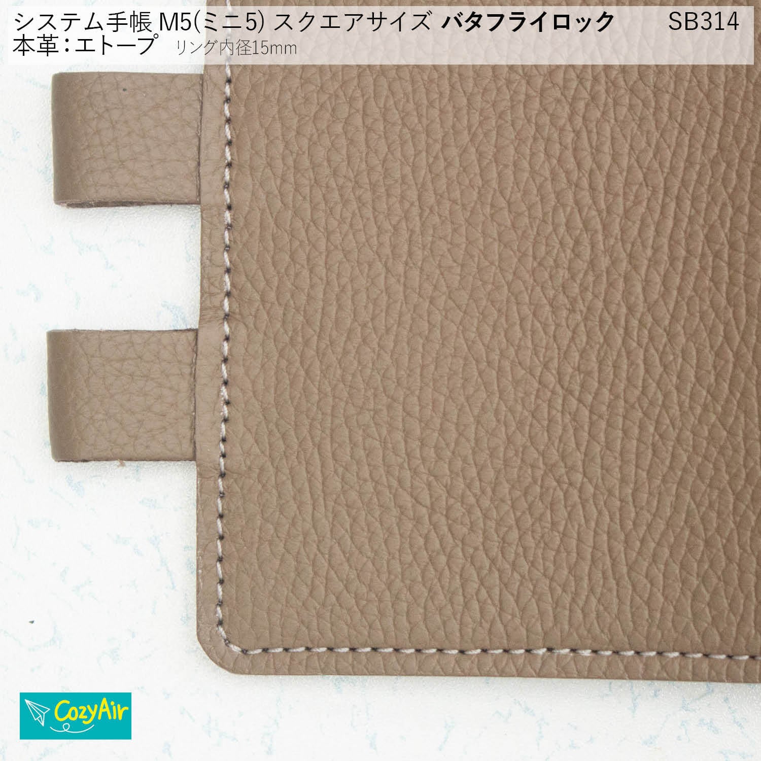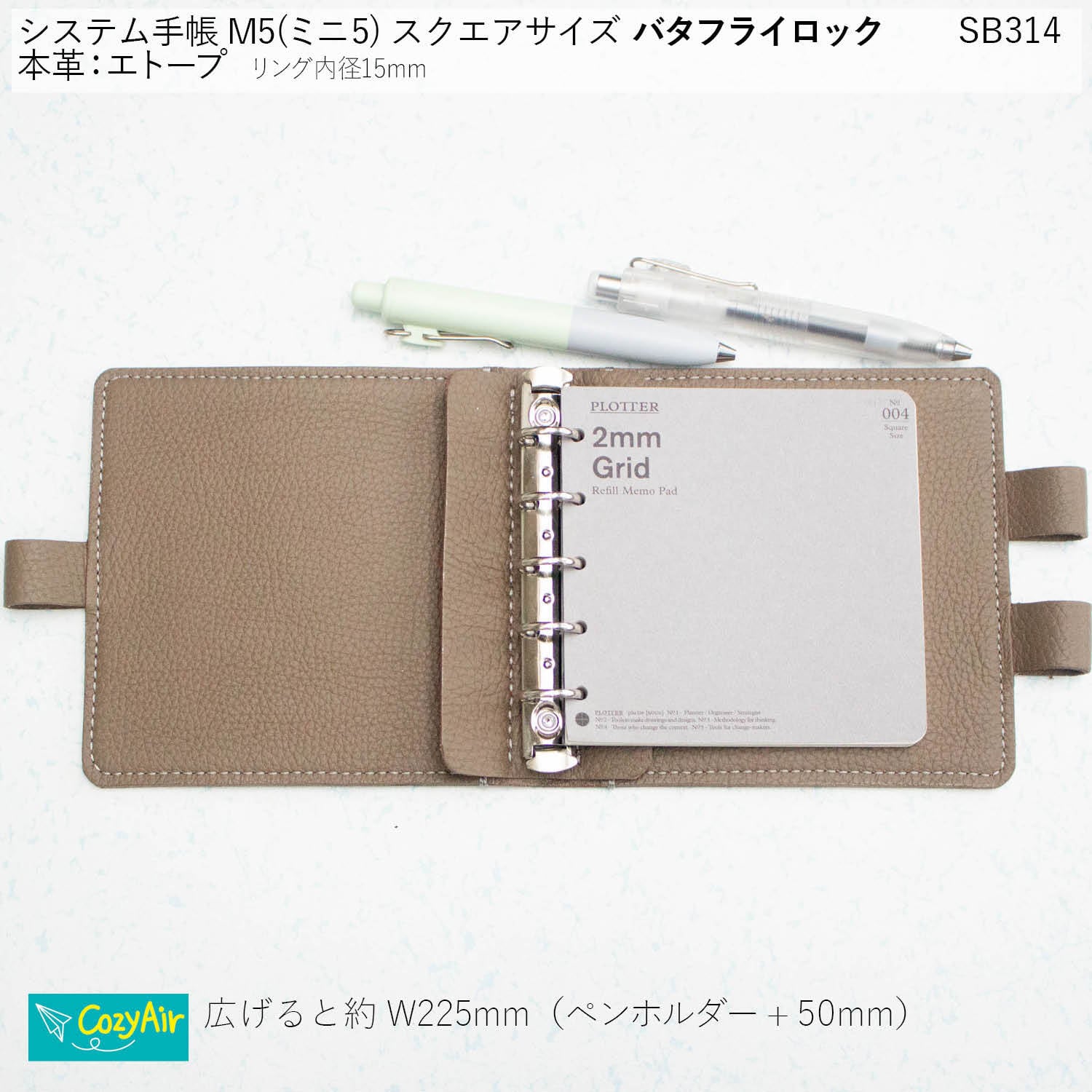 SB314 ミニ5スクエアサイズ バタフライロック 横長ノートのシステム手帳 5穴 リング径15mm 選べるペンホルダーサイズ 本革エトープ