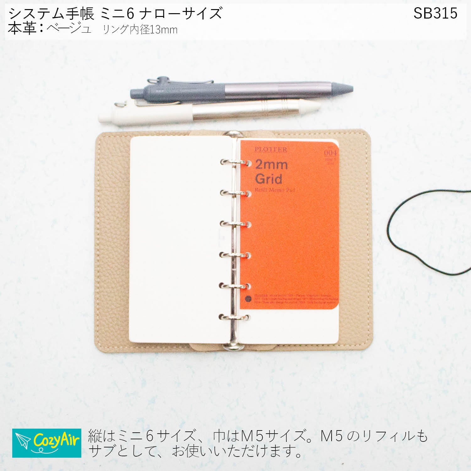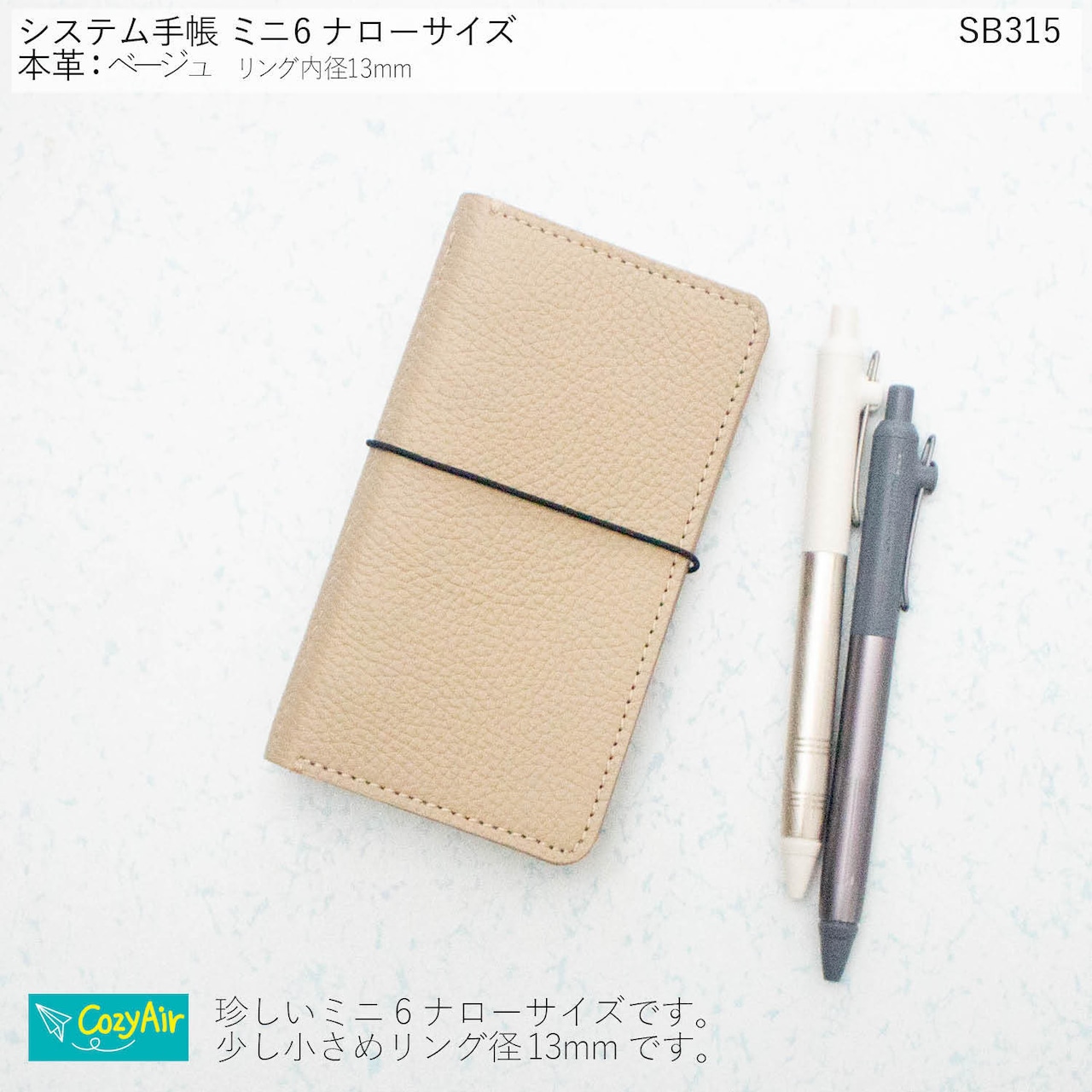 SB315 ポケットにスッと収まるシステム手帳 ミニ6ナローサイズ シンプルデザイン リング径13mm 本革ベージュ