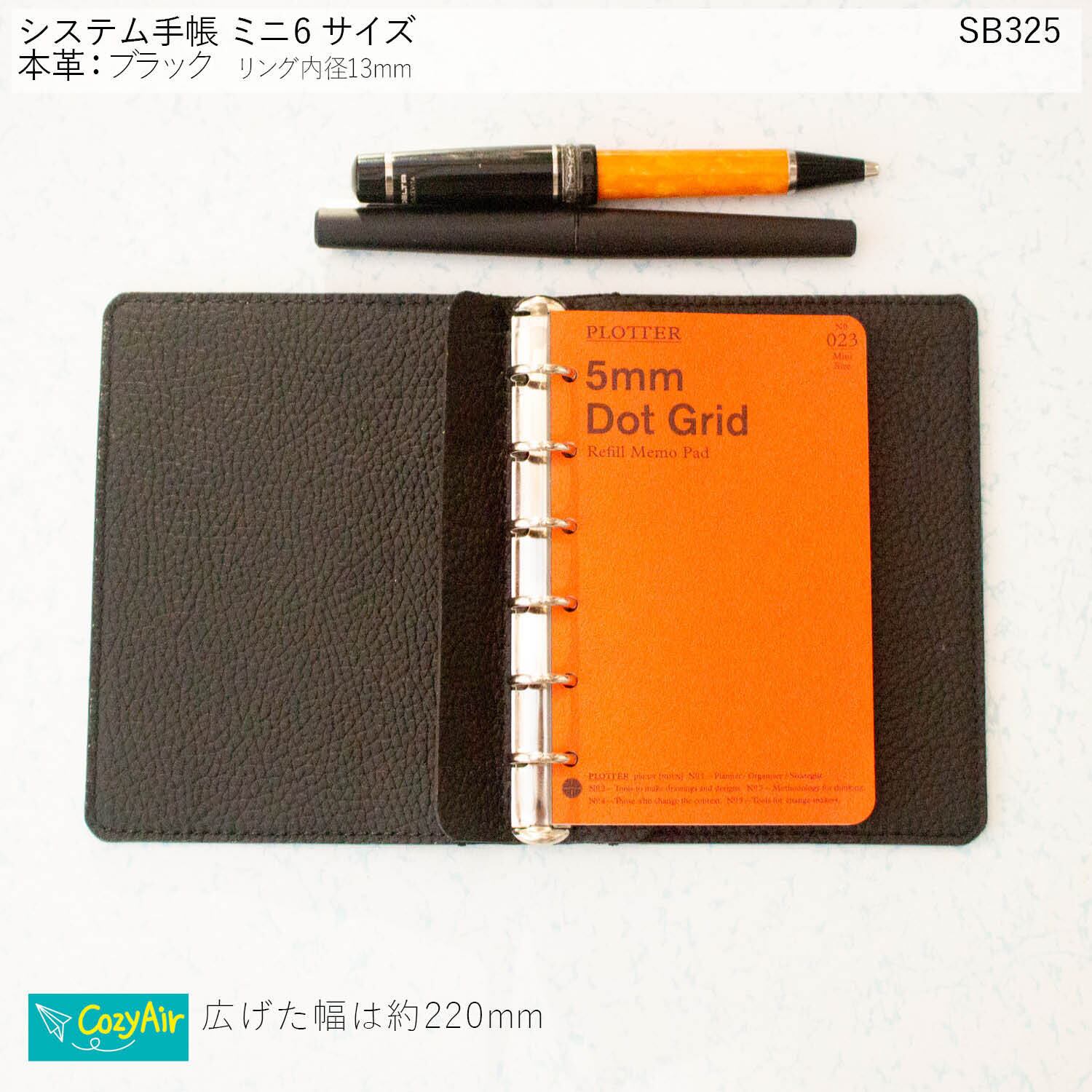 SB325 手のひらに収まるシステム手帳 ミニ6サイズ シンプルデザイン リング径13mm 本革ブラック