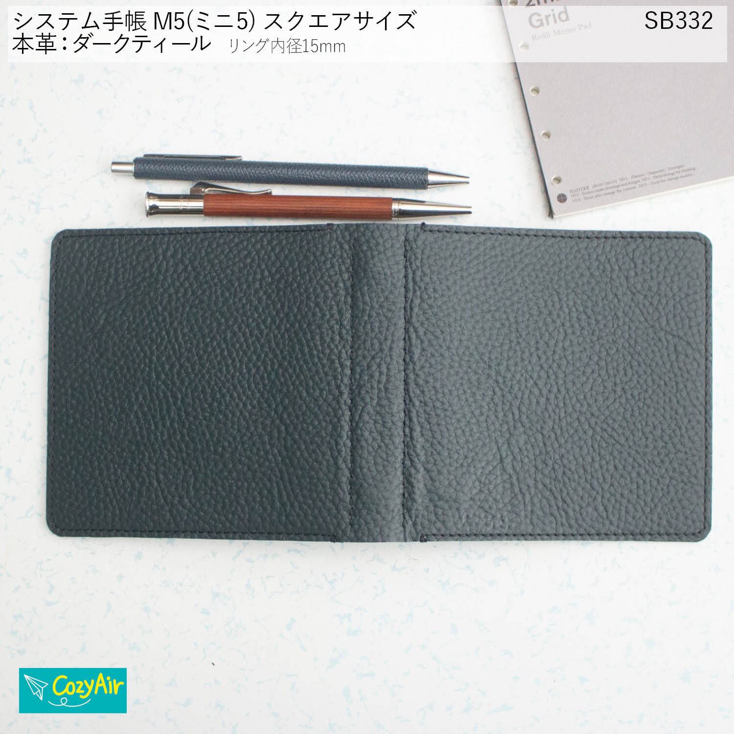 SB332 ミニ5スクエアサイズ 優雅な佇まい 横長ノートのシステム手帳 5穴 シンプルデザイン リング径15mm 本革ダークティール