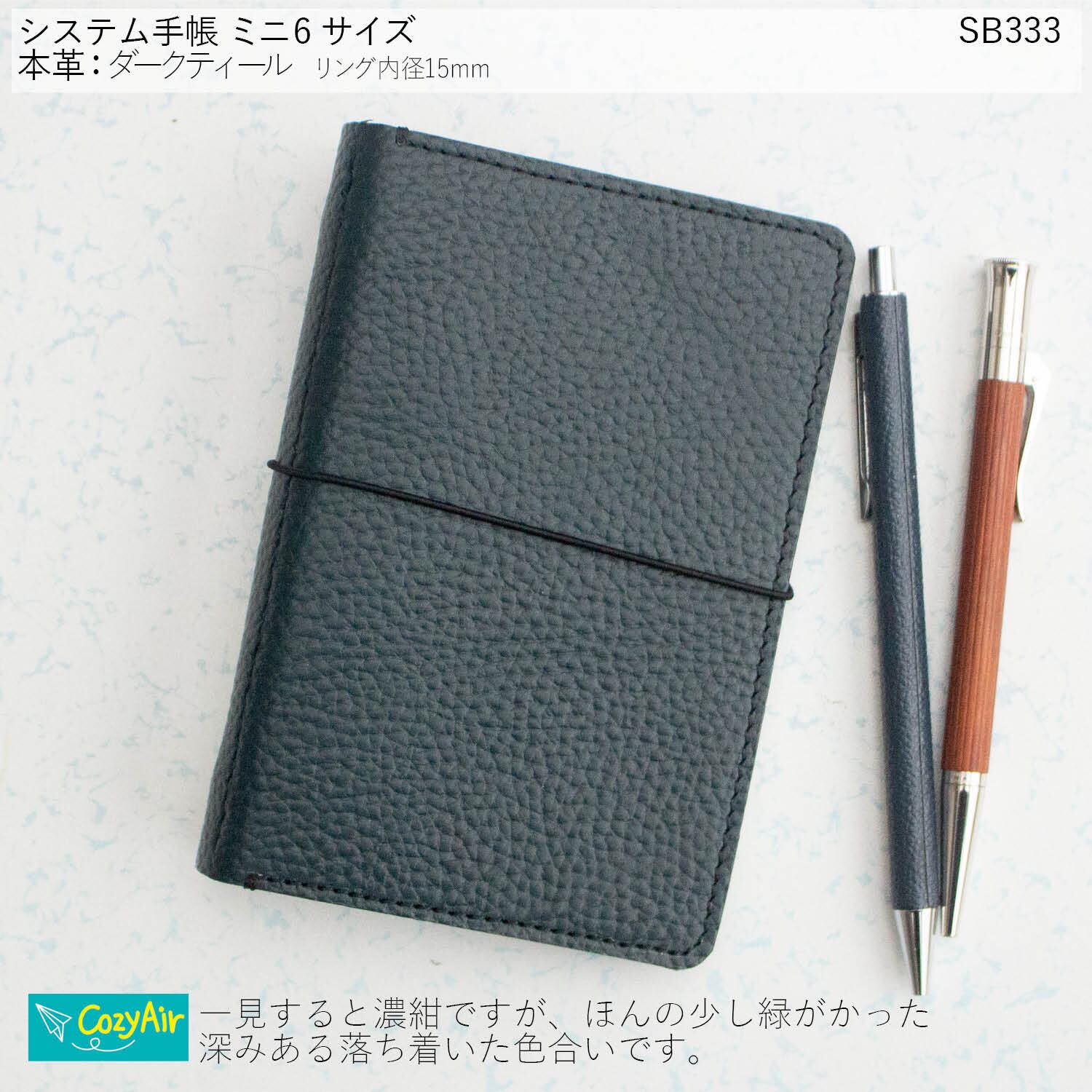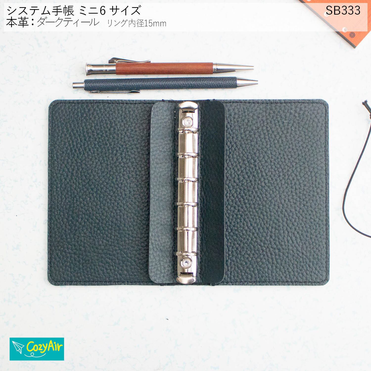 SB333 手のひらに収まるシステム手帳 ミニ6サイズ リング径15mm シンプルデザイン 本革ダークティール