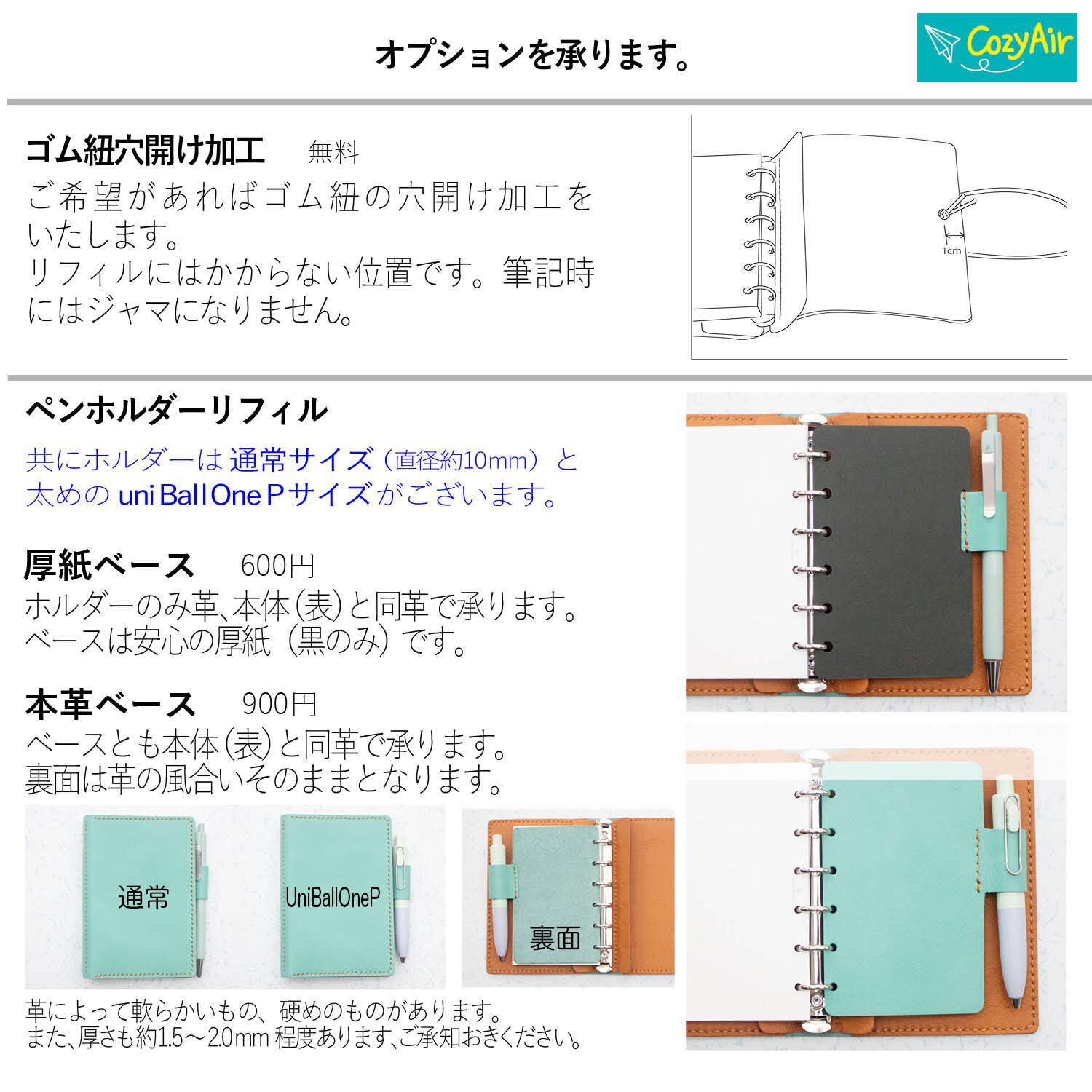 オプションでゴム紐穴加工やペンホルダーリフィルも承ります。
