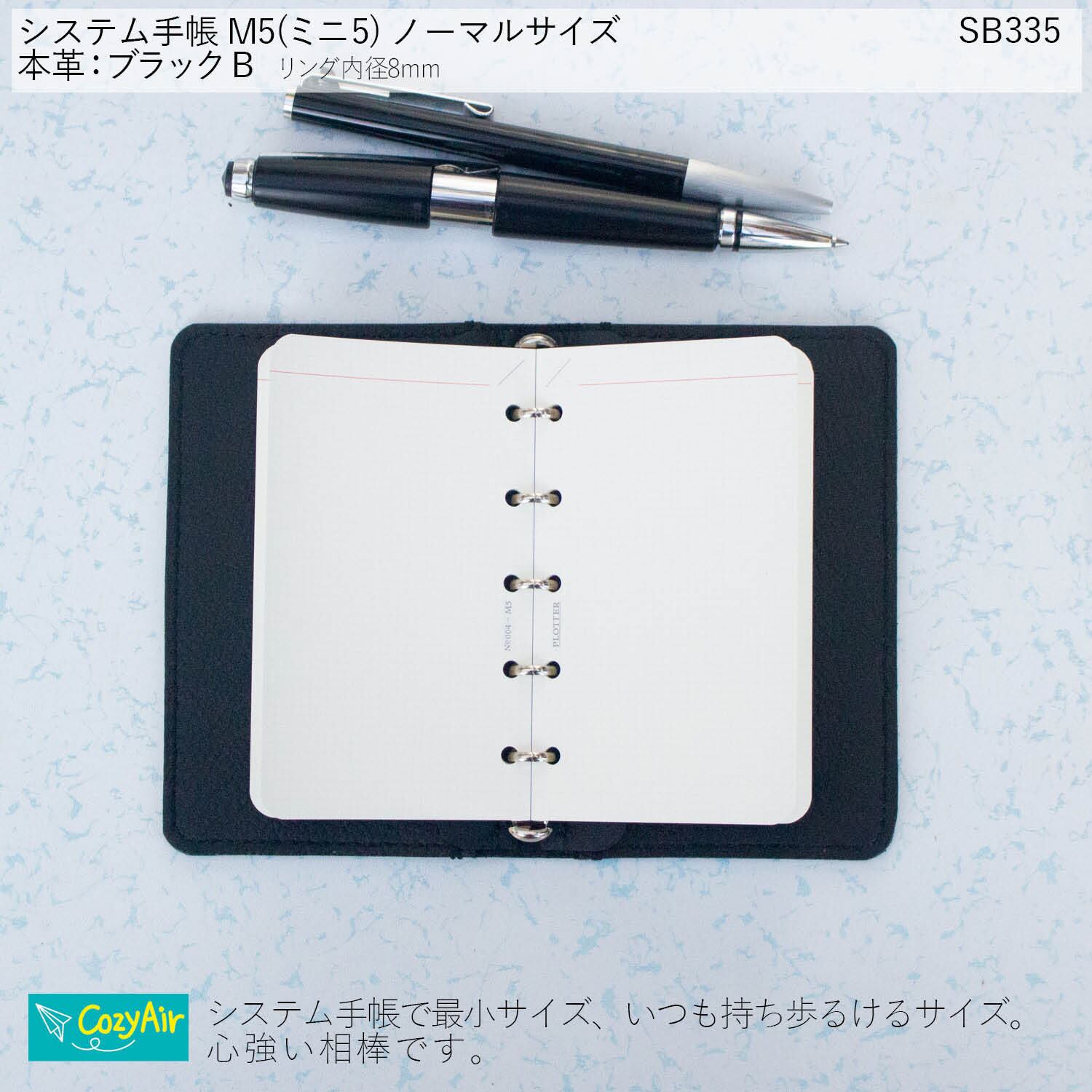 SB335 【受注制作】ミニ5(ノーマル)サイズ システム手帳 5穴 リング径8mm 革・ブラックB