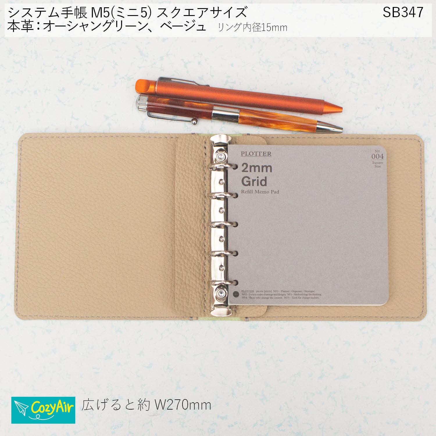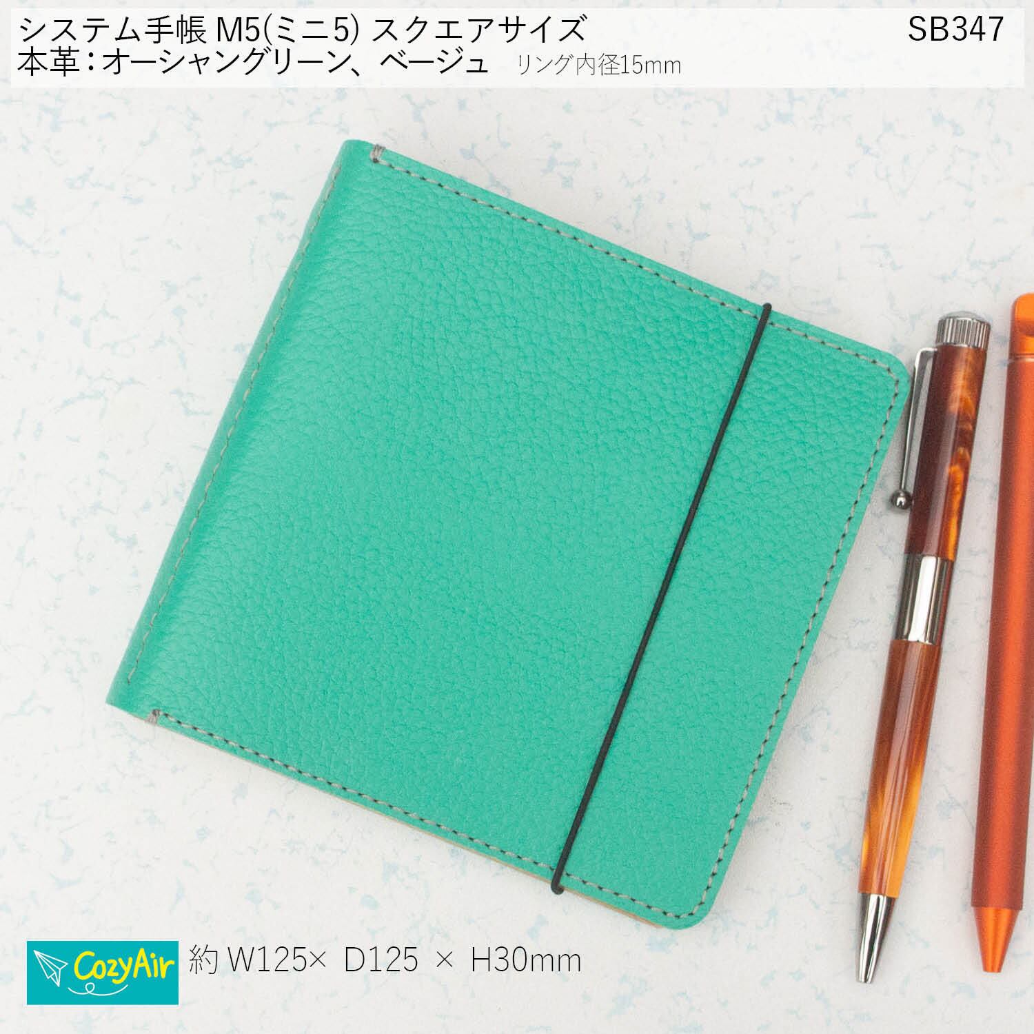 SB347 【受注制作】ミニ5スクエアサイズ 優雅な佇まい 横長ノートのシステム手帳 5穴 シンプルデザイン リング径15mm 本革オーシャングリーン、ベージュ