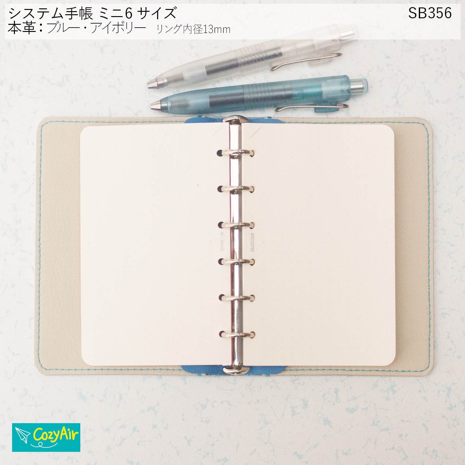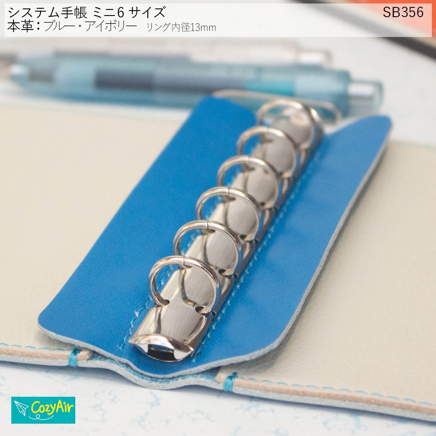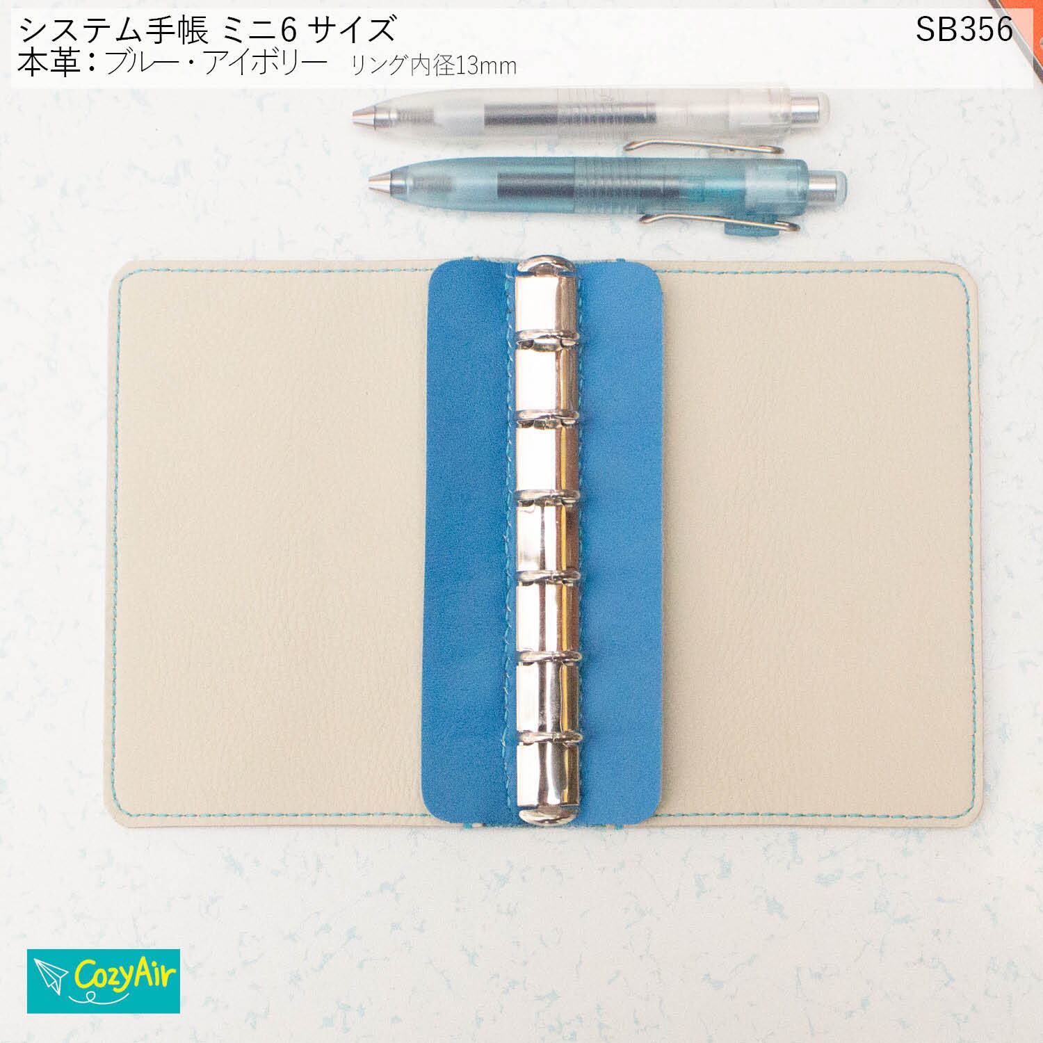 SB356 【受注制作】手のひらに収まるシステム手帳 ミニ6サイズ シンプルデザイン リング径13mm 本革ブルー・アイボリー