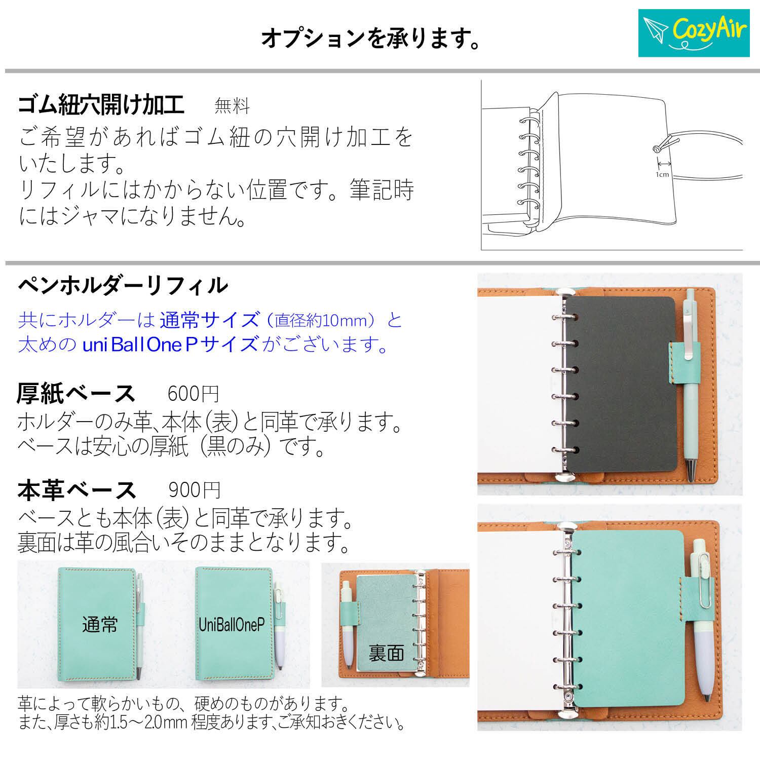 オプションでゴム紐穴加工やペンホルダーリフィルも承ります。ペンホルダーの内径は2種類ご指定いただけます、通常用(内径約10mm)と小さめの手帳にぴったりで少し太めのuni Ball One Pタイプです。