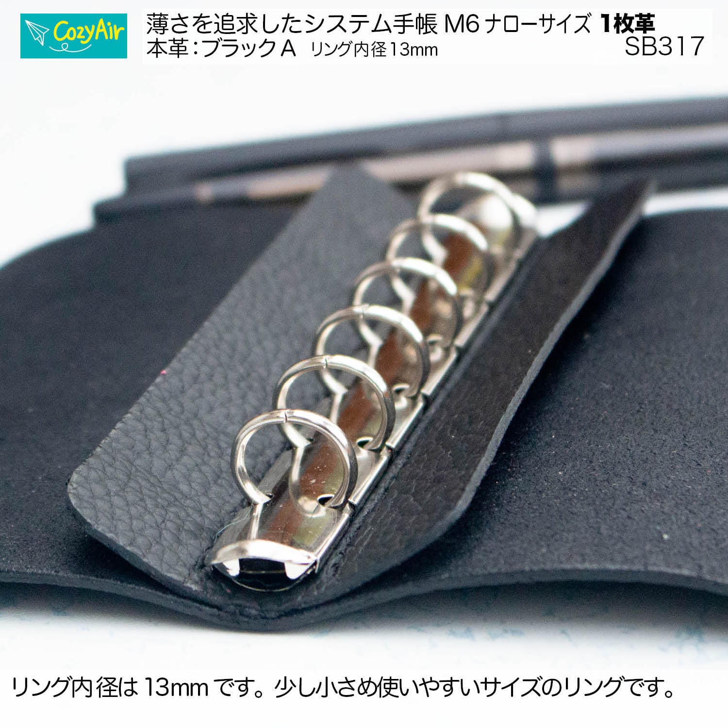 SB317 薄さを追求したシステム手帳 ミニ6ナローサイズ シンプルデザイン リング径13mm 本革ブラック 1枚革