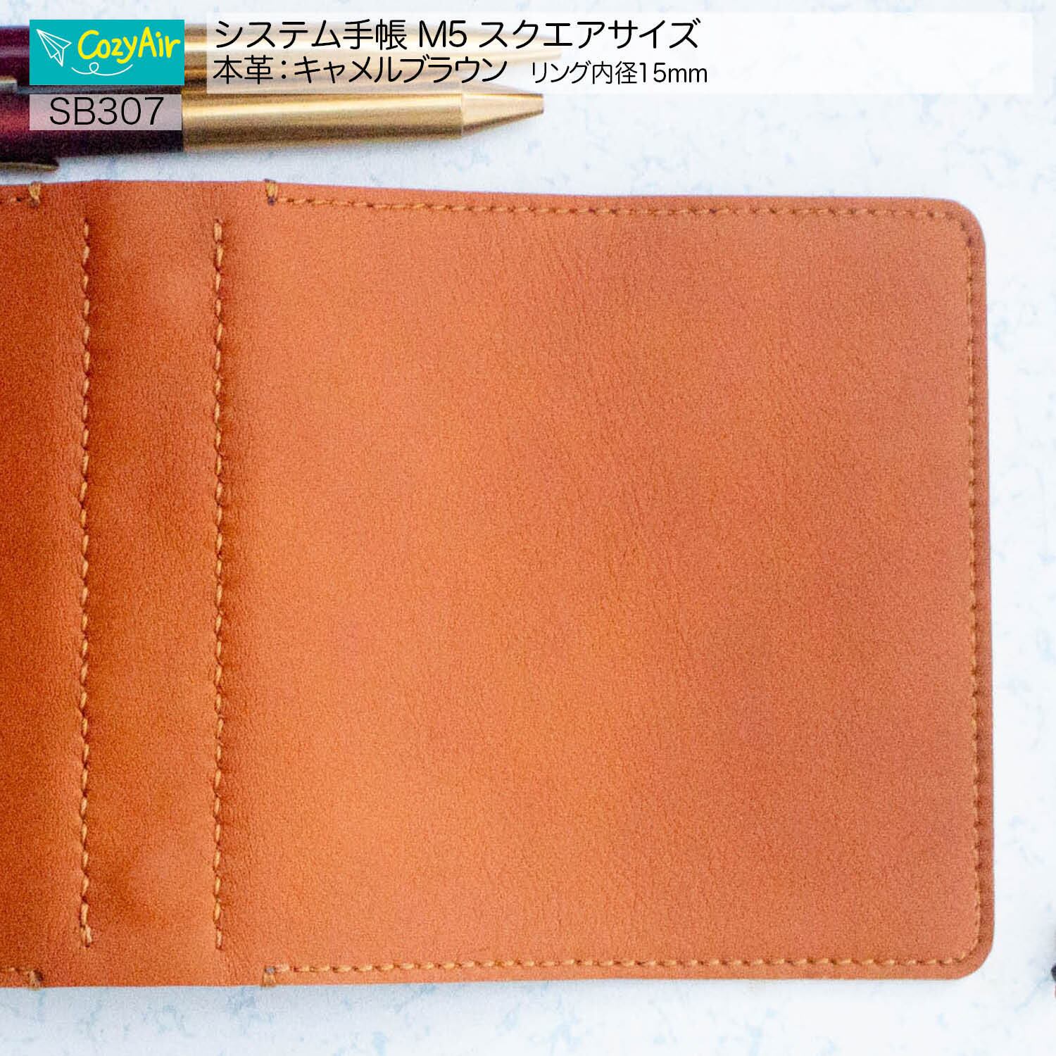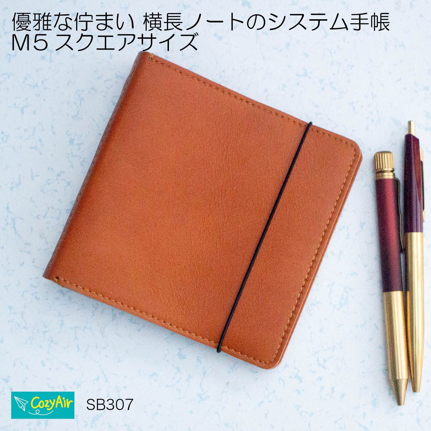 SB307 ミニ5スクエアサイズ 優雅な佇まい 横長ノートのシステム手帳 5穴 シンプル 15mm 本革キャメルブラウン
