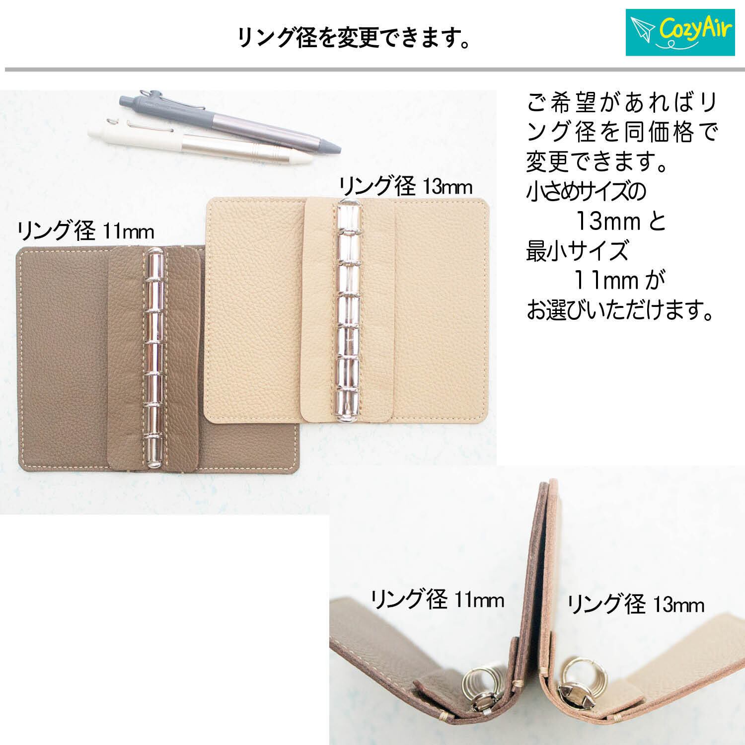 人気のミニ6規格はシステム手帳の中でも小さく手に収まる大きさですが、さらに持ち歩きやすくナローサイズを製作しました。すすべて手作りで仕上げています。型紙から作ったオリジナルデザインですで、リングサポーターも標準装備しています。