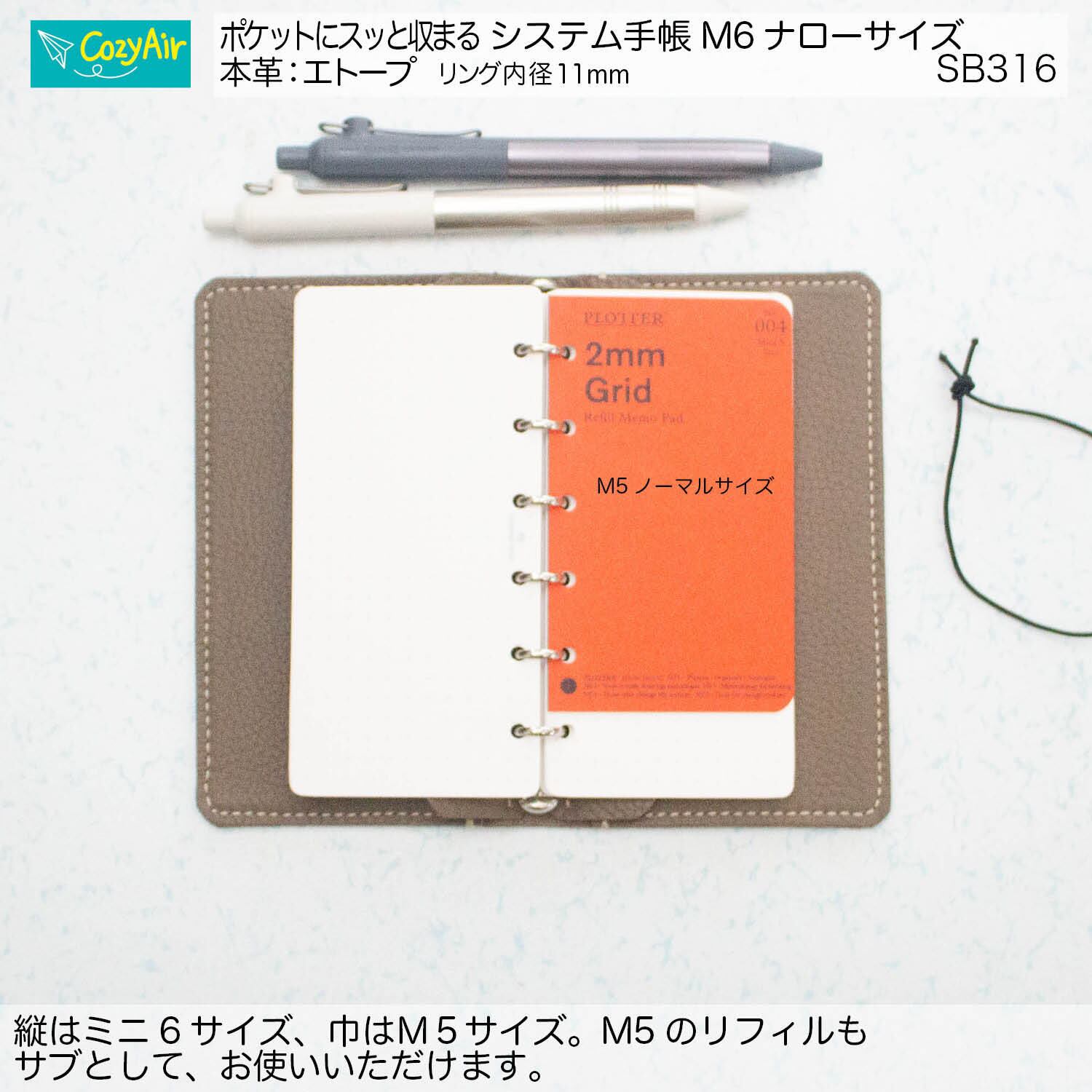 SB316 ポケットにスッと収まるシステム手帳 ミニ6ナローサイズ シンプルデザイン リング径11mm 本革エトープ