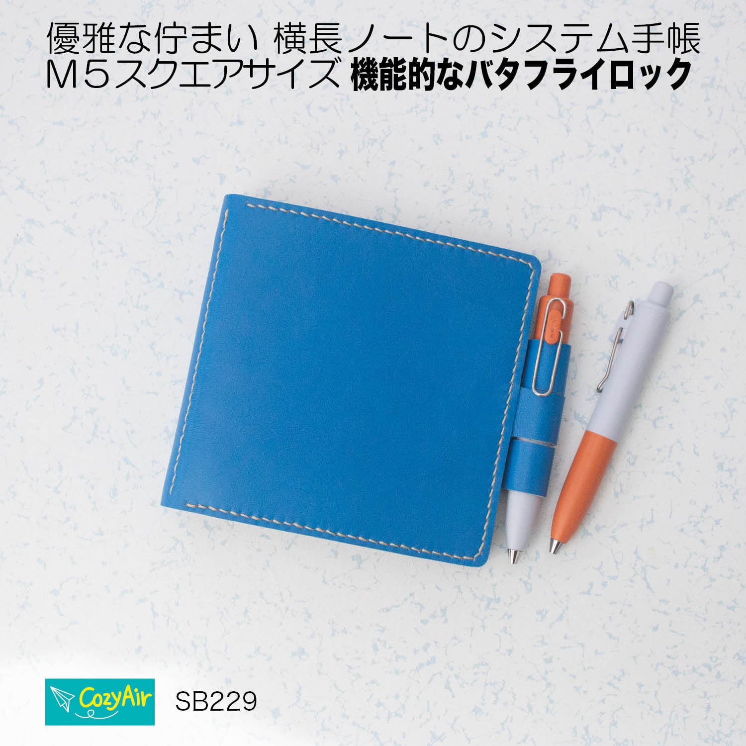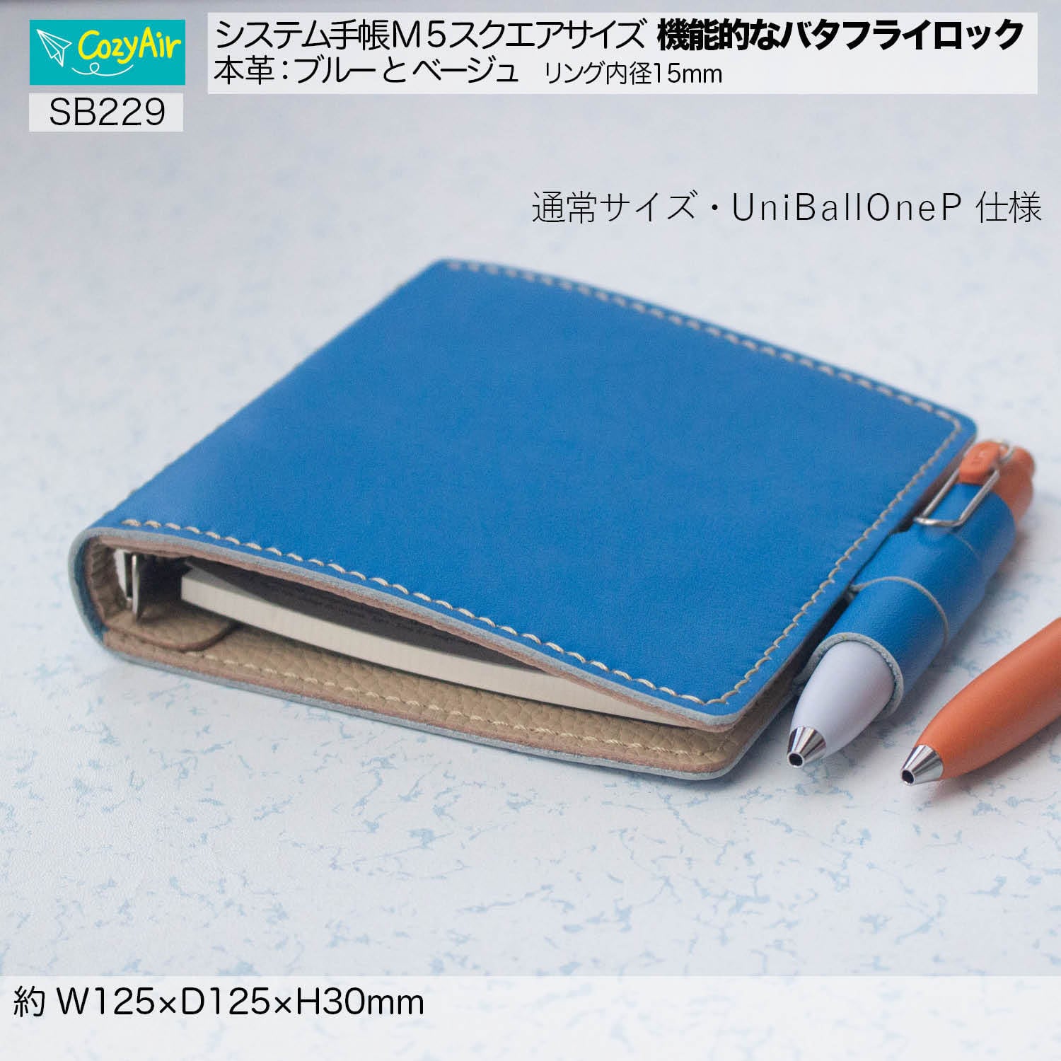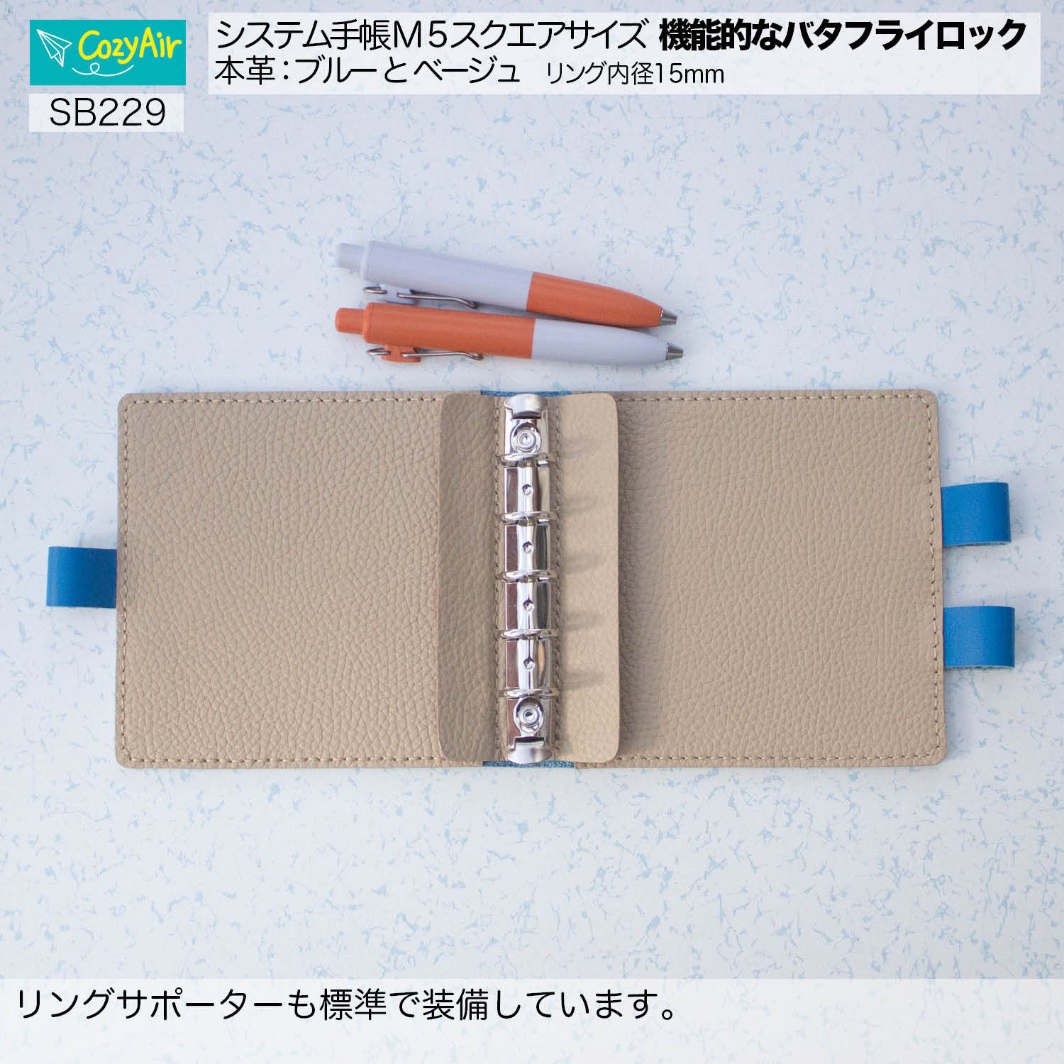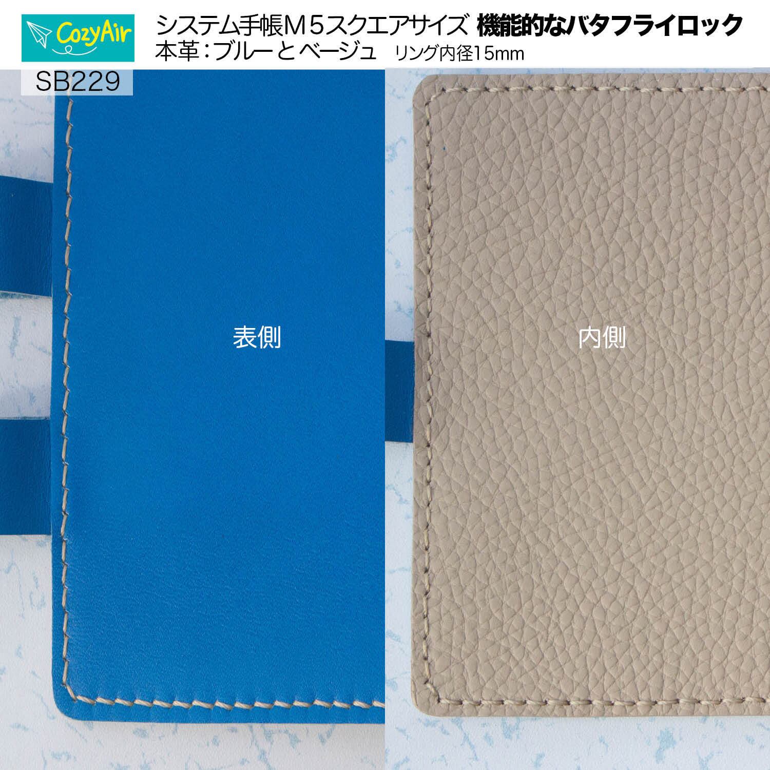 SB229 【受注制作】ミニ5スクエアサイズ システム手帳バタフライロック 5穴 リング径15mm 本革・ブルーとベージュ