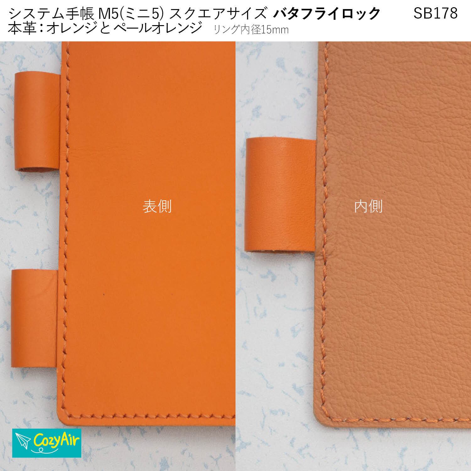 SB178 【受注制作】ミニ5スクエアサイズ システム手帳バタフライロック 5穴 リング径15mm 本革・オレンジとペールオレンジ
